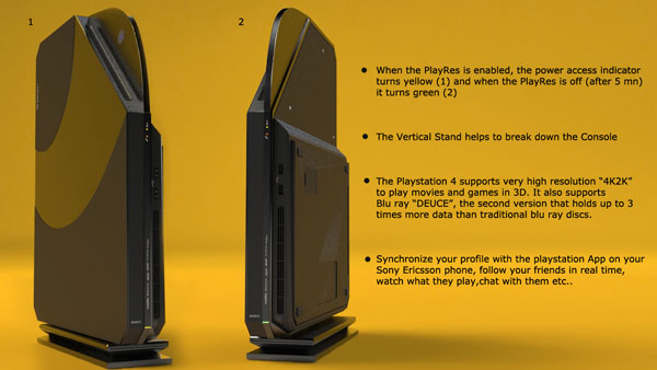 I love me some Playstation! Not only does this PS4 concept have a natural and believable aesthetic evolution from the PS3, but it is composed of 60% recyclable materials, making it a much greener choice. It also uses 0 watts in standby mode, and with its ECO Restart function games can be saved, the console turned off, and turned back on to resume exactly where the user left off without the need for a full start up, reducing energy waste and prolonging the life of the unit.Further, the unit will automatically shut off primary power after each 30 minute period of playtime and draw energy from it’s rechargeable battery for 5 minutes. The same feature also assists in preventing data loss during a power outage.